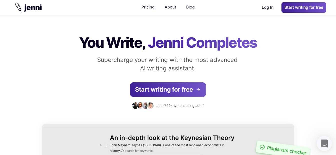 Jenni An AI writer named Jenni will finish your work for you depending on what you’ve previously written and the text’s title. It will prompt you to specify the title and choose the tone before it begins writing (professional, friendly, persuasive, academic). You can provide a brief description of your piece as well. You are then asked to confirm or deny each new statement as it is written, sentence by sentence. After the free trial, the price is $12 per month.