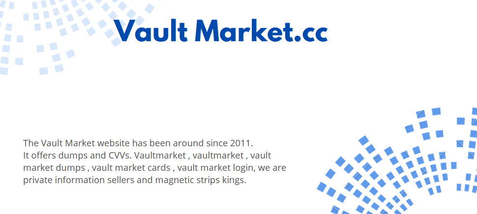 There are dumps and CVVs available on the site. Vaultmarket, vaultmarket dumps, vaultmarket cards, and vaultmarket login sell private information and magnetic strips.